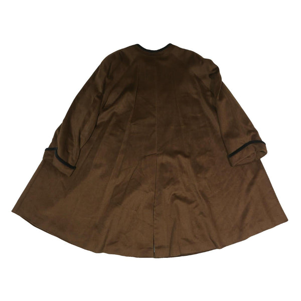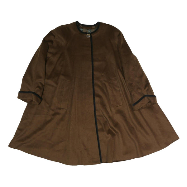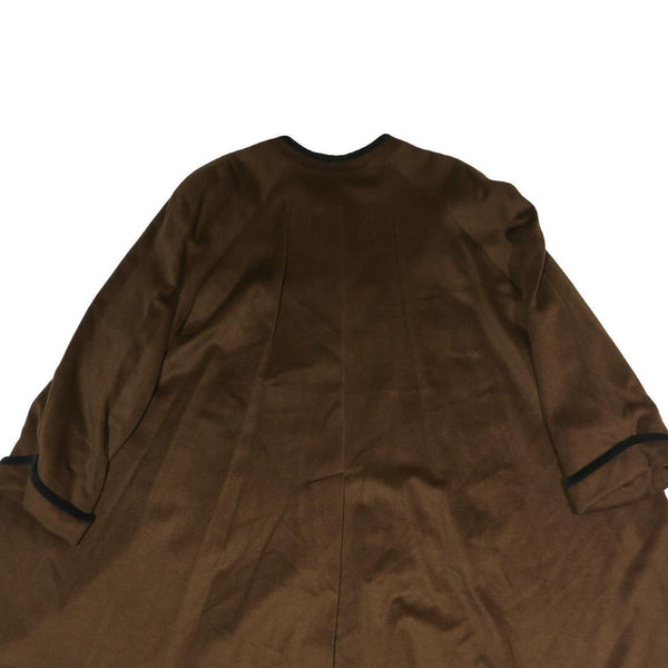 This Womens YELL jacket features a rich brown colour with black trim detailing along the collar, button line, and cuffs, creating a subtle yet elegant contrast. The jacket fastens with buttons and has a round neckline, offering a classic and timeless design.