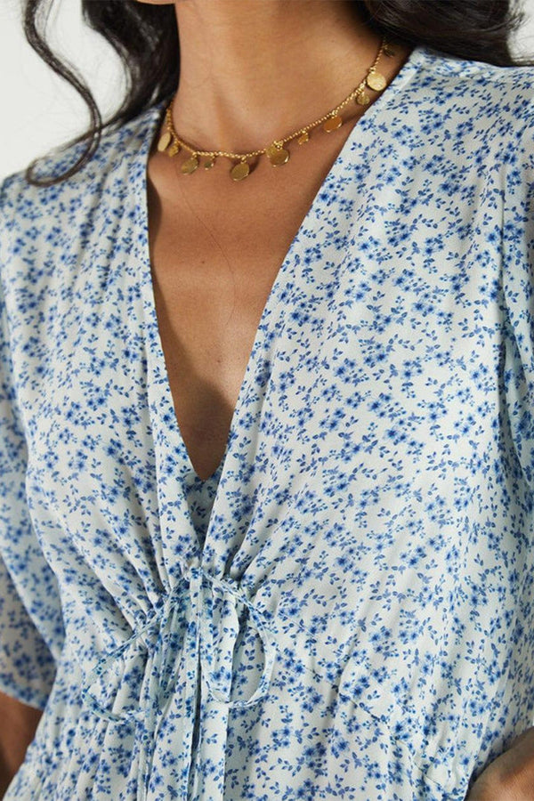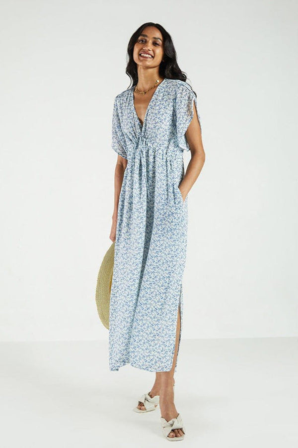This flowy dress has a tie up at the bust which helps you adjust the dress to your size. Easy to throw on over a swimsuit or worn on its own, this dress always makes a statement.