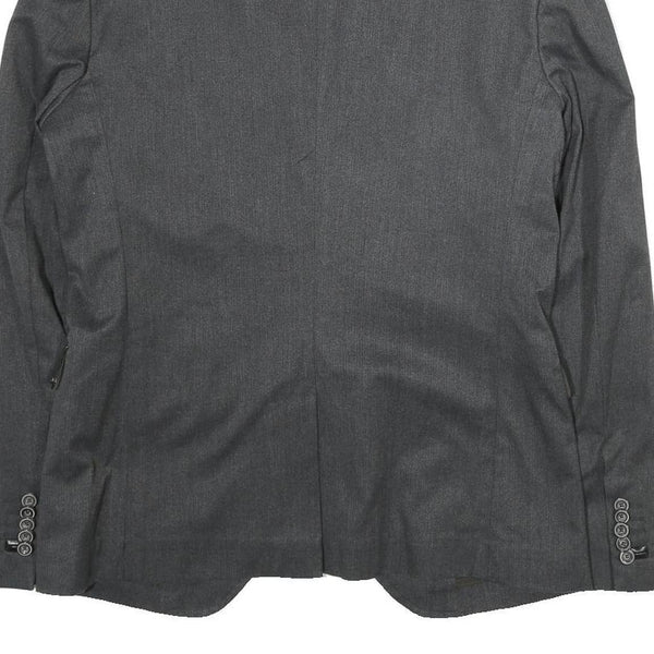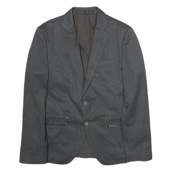 This ZARA Mens jacket is a sophisticated grey with a subtle tailored look. It features a classic blazer style with a notched collar and a two-button closure at the front. The jacket has three external pockets including two flapped pockets and a breast welt pocket, complemented by button details on the sleeves. The interior is lined for comfort and a polished finish.