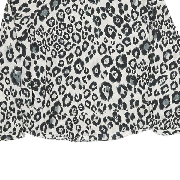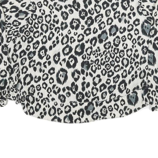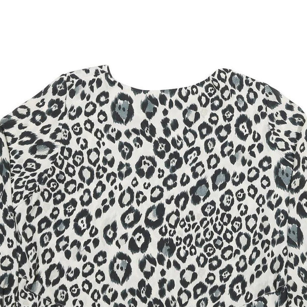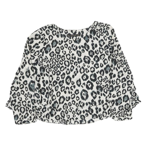 This ZARA womens blouse features a bold black and white leopard print pattern with hints of grey, making it a striking statement piece. The top has a loose, flowing fit with long sleeves and a classic round neckline, crafted from a soft polyester blend that offers a smooth and comfortable feel against the skin.
