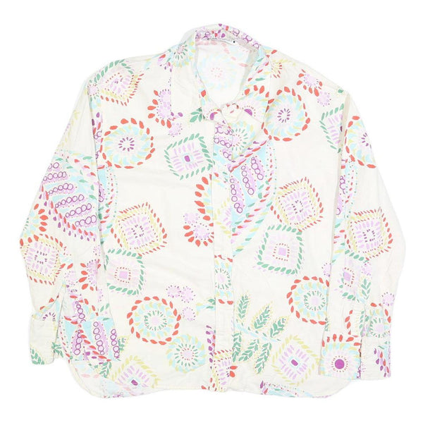This ZARA womens shirt features a white base adorned with a colourful, abstract printed pattern consisting of circular, leaf, and diamond shapes in red, purple, mint green, and pastel blue hues. The print is evenly distributed across the front, back, and sleeves, creating a lively and artistic visual effect.